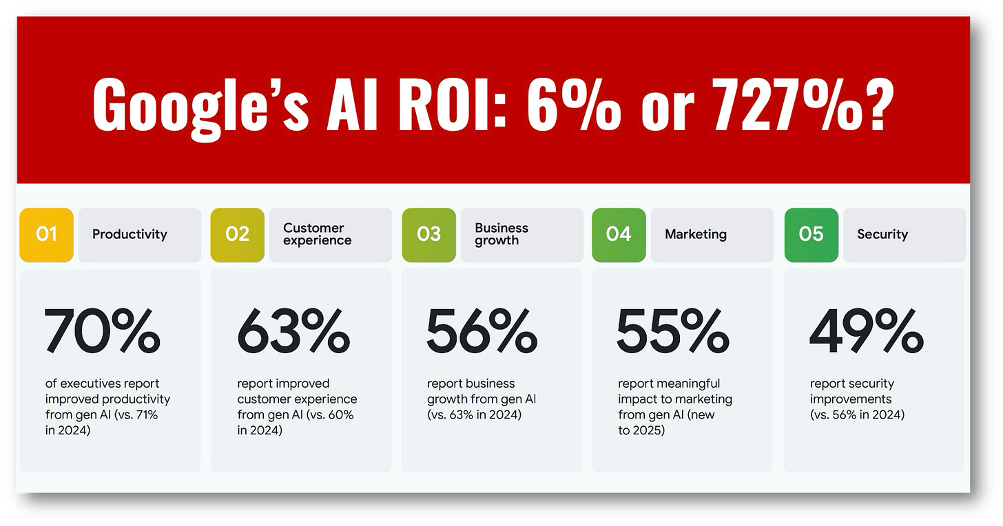 Google's survey of AI users reports ROI figures for AI that range from a credible 6% to an absurd 727%.