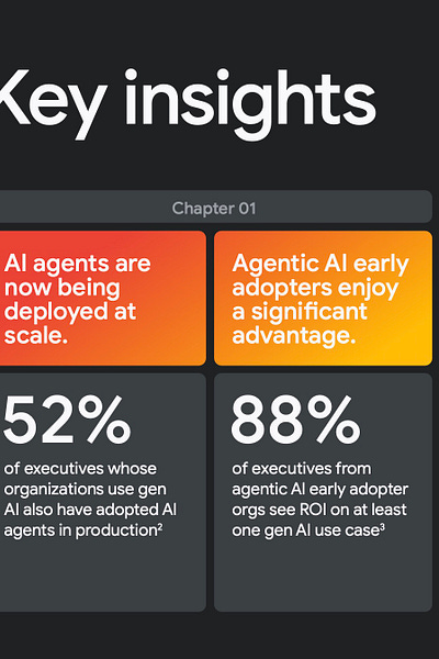 🔹 The early adopter advantage: A distinct group of "agentic AI early adopters," representing 13% of executives surveyed, indicate their organizations are dedicating at least 50% of their future AI budget to AI agents and already have agents deeply embedded across operations. 88% of these leaders report their organizations are seeing ROI from generative AI on at least one use case, compared to a 74% average across all organizations.