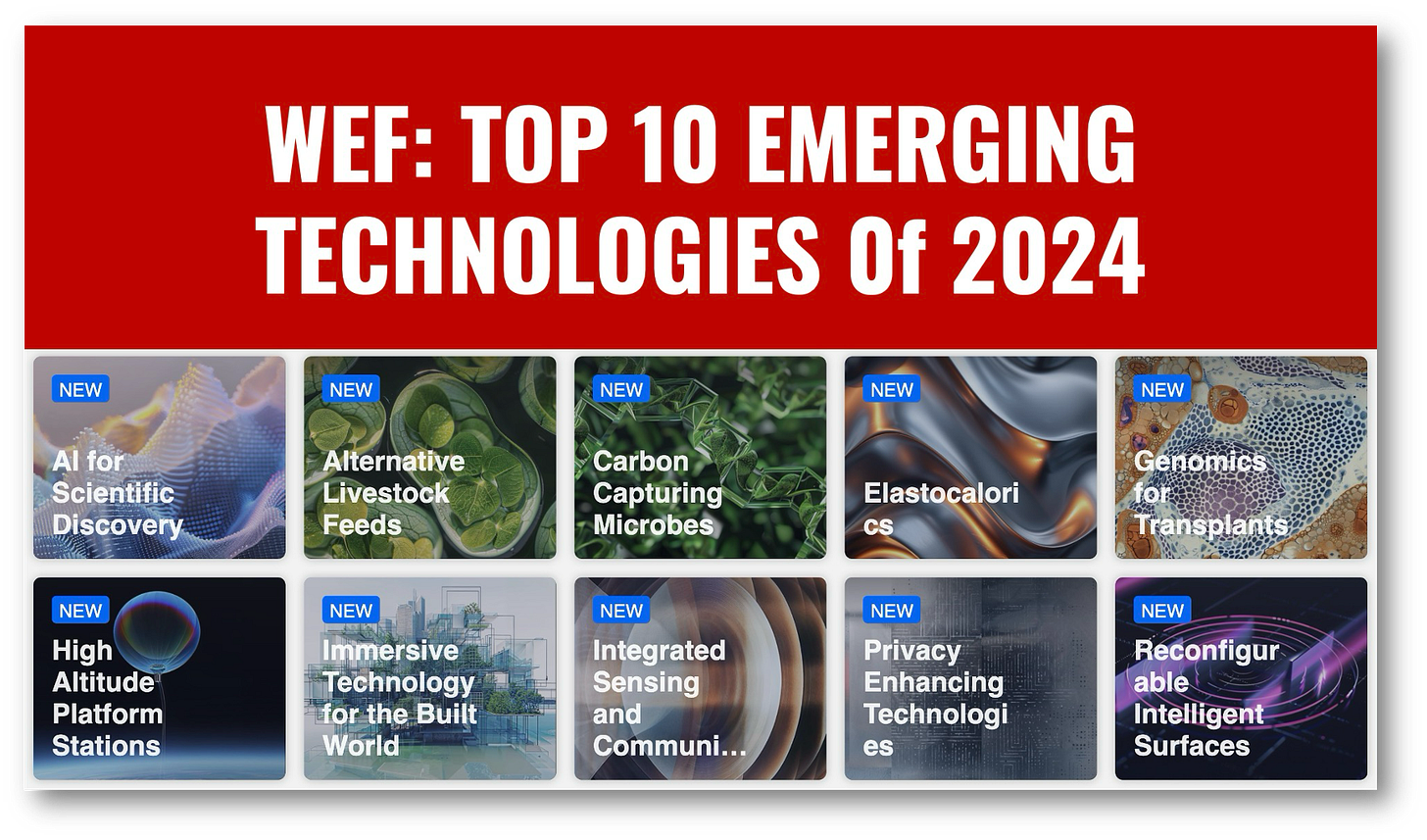 Others, like elasto-calorics, carbon-capturing microbes, and reconfigurable intelligent surfaces, are newer tech, so only time will tell if WEF got them right.